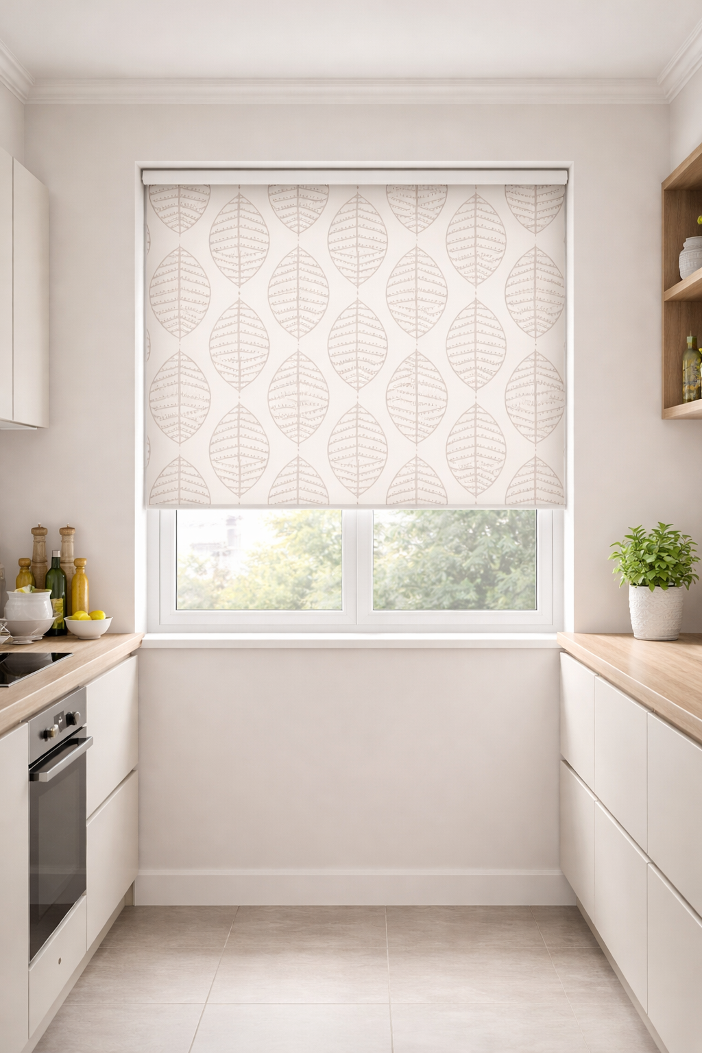 Create a calm yet stylish statement with our Boheme Balance Roller Blind, expertly made to measure by M2M Blinds. Featuring a soft, muted grey-beige backdrop with a pale stencilled leaf design, this fabric offers the perfect harmony of neutral elegance and nature-inspired detail – ideal for kitchens, bathrooms, utility rooms, offices and modern minimalist interiors.