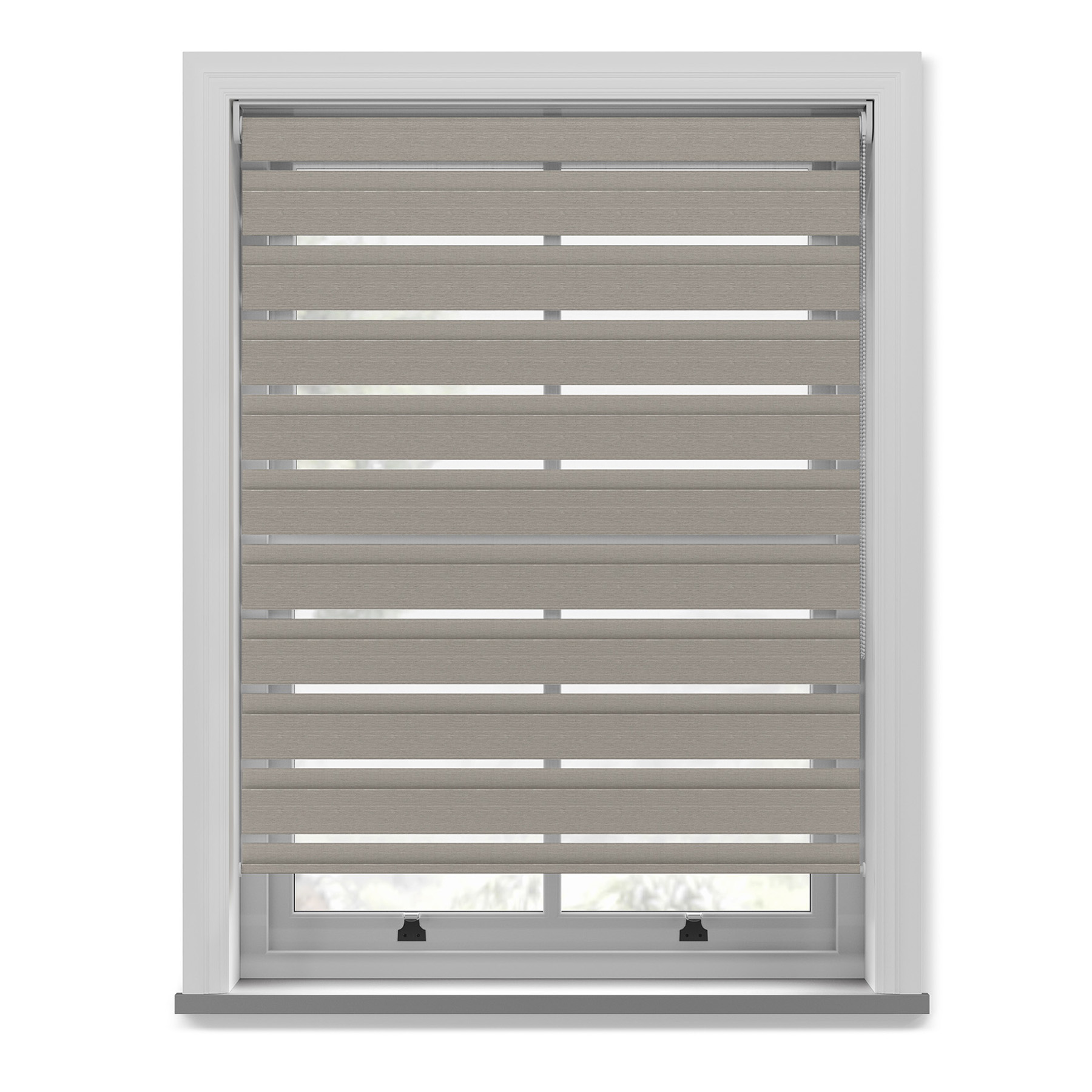 The dual-panel design features alternating sheer and dim-out bands, allowing you to smoothly control privacy and daylight without lifting the blind.