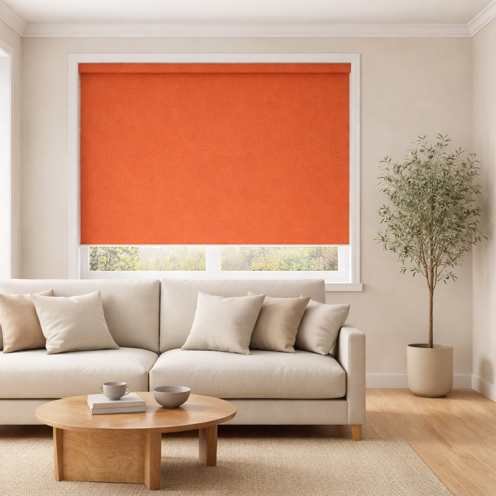 Add warm, modern energy to your space with our Splash Heat Roller Blind, custom-made to measure by M2M Blinds. Featuring a vibrant, fiery red-orange tone with a smooth, satin-matte finish, this fabric is perfect for making a bold statement in kitchens, playrooms, creative studios, offices or any room that needs a burst of colour and personality.
